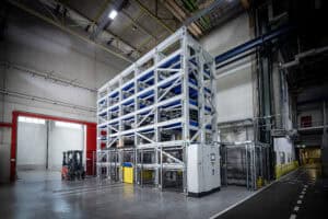 Das Ein- und Auslagern erfolgt über ein Regalbediengerät mit intelligenter Übergabestation, die einen unabhängigen Betrieb sicherstellt, ohne die laufende Fertigung zu beeinträchtigen. Eine technische Herausforderung stellte dabei die exakte Übergabe der schweren Paletten vom Regalbediengerät in das Hochregal dar. Der Lastübergang musste so präzise konstruiert werden, dass keinerlei Höhendifferenzen entstehen und ein sicherer Materialfluss gewährleistet ist.