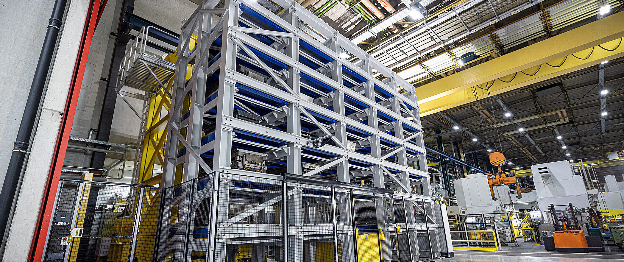 Das gemeinsam entwickelte Konzept basiert auf einem Hochregallager mit integrierter Regalbedienlösung. Innerhalb eines Hallenbereichs können nun bis zu sechs Presswerkzeuge übereinander und fünf nebeneinander gelagert werden. Dadurch entstand eine Lagerkapazität von 30 Plätzen mit jeweils zehn Tonnen Nutzlast.